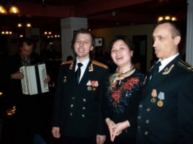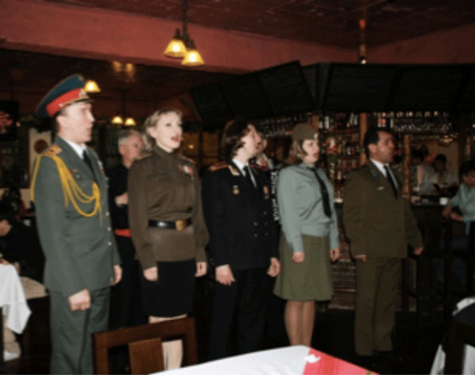 我和几个朋友虽然是五十年代后生,但也跟在哥哥姐姐们熟悉这些前苏联的歌曲。即来吃饭,就得凑趣儿。尽量倾听他们的娱乐音乐。即是顾客,对歌手们也是主客相待,就是因为尊重他们的国家和民族、尊重他们卖力的职业道德、他们唱得也实在好。最近的一次去是大约五年前。一个朋友一定坚持,点了请他们唱苏联国歌。看得出歌手的兴奋,两位回后屋、召集了全体,换了全套的三军礼服复出(竟有十几位男女高低音相配),看到他们严肃而兴奋地“上台”(其实也没有舞台,不用音响,就是在餐桌之间即兴行走歌唱),顾客也迎身起立听他们的,一时竟变成一个很庄重的场面。我们只在苏联老电影和美国新电影里听过他们的国歌。