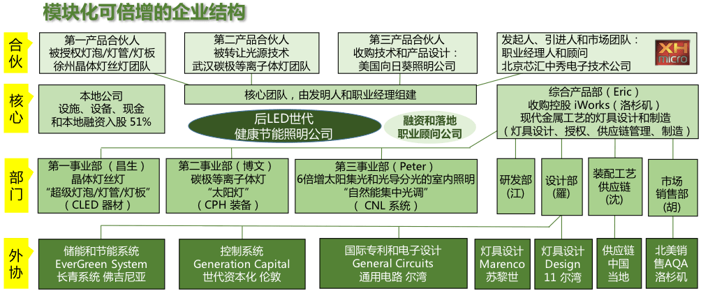 “后LED世代节能健康环保照明照明”的新项目:责任人:羅晉。融资和落地洽谈人:沈英丁、江建志、王惠昌。技术和产业源头洽谈人:邢文杰。财务:李郡。