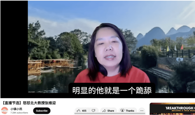 这人与张维为正好配一对儿:她说“维迎”者,“迎合他人”,“明显的他就是一个跪舔”。我说“维为”者,“维护行为”也,明显的也是一个跪舔。一个御用酸儒文邹邹,一个市井泼妇粗狂暴。面相一副对聪明人和明白人嫉妒不过的那种小人嘴脸。不是社交网,哪有她说话的份儿?先否定了龙应台,再说张维迎就像龙应台。不知为什么龙应台是坏人?无论如何再标签化另一个人作为前提,结论就是后者也是坏人。这就是文革的“革命小将”逻辑。不然,哪里轮得上他们这些狗屁愚人来批判别人?龙、张说话是给她这种人听得懂的吗?以小人之心度君子之腹,以自己极度的无知揣摩当今世界的趋向,以愚笨的头脑看科技,拿着狡辩当理说。“小镇小民”,无知便是勇气。