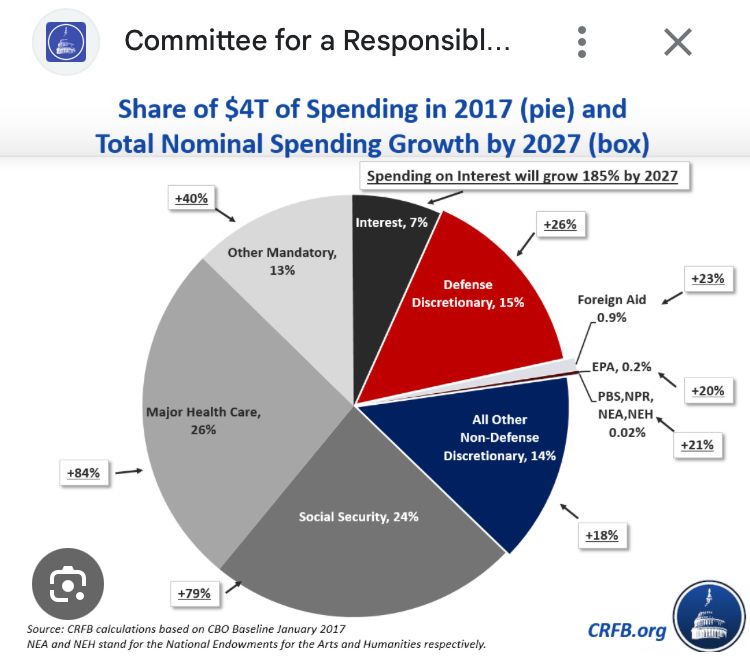- 2) Social Security, Medicare, Medicaid, defense, each represents 25% of the total federal budget