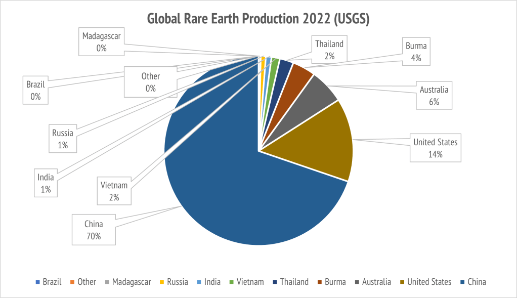 看以上两张图的十年数据:(1)风力发电和电动汽车,是两项因巴黎气候协议要求的稀土元素增量因素(虚线)。其中美国已经退出了协议,这两项主流的对稀土材料消耗都不成功,实际上消耗过度,并没去的什么效益,真得其需求会继续倍增吗?而中国虽在巴黎协议中,却甘愿被罚,拼命开采稀土矿、建造提炼设施、增添烧煤电厂、制造和囤积磁铁,来供应全球的虚夸需求。(2)中国的稀土元素出产是世界第一,但自己的需求也是世界第一。因为主要是它还要为全世界制造永久磁铁。 美国的稀土元素在世界的生产量(截止90年代初曾是世界的90%),2016年一度是0%;但2022年已经是又恢复到了14%(世界第二),正好抵消它所消耗的13%。所以,当前双方各自差不多是供需自相平衡的。虽然中美双方嚷得欢,但在两边的“国家计划经济”干涉下,却看不到”卡脖子“的实际数据。